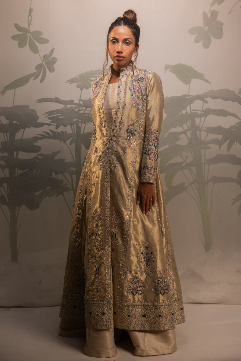 Shimrin is a sophisticated formal wedding ensemble that reflects elegance through fluid silhouette and refined embellishment. Rendered in a gold and beige palette, the design features a long kalidar dress crafted from luminous tissue fabric, paired with a coordinated sharara that adds volume and movement.