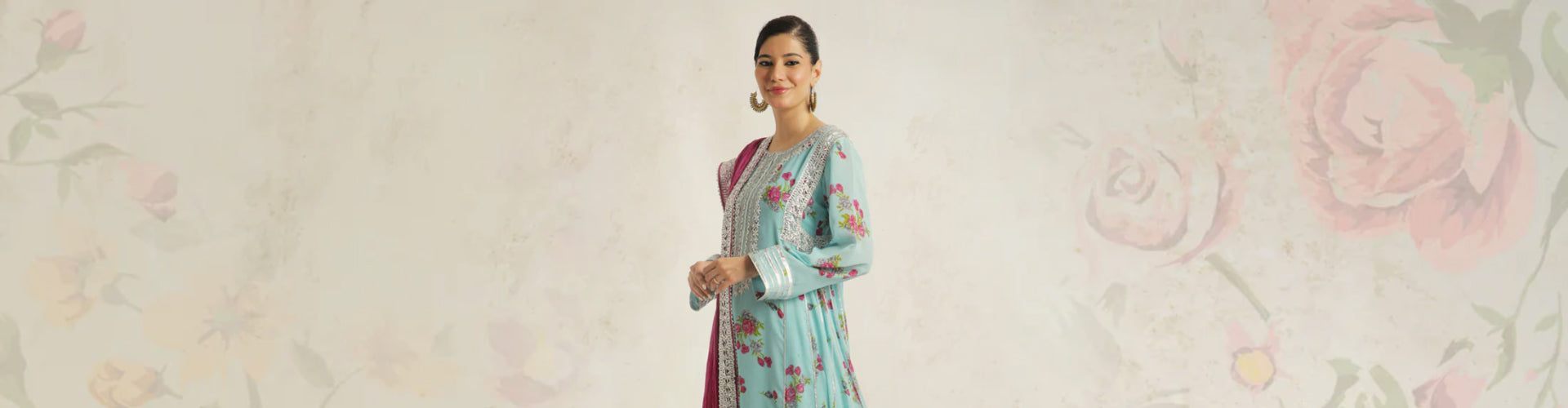 A classic ensemble featuring a mint colored 16 kali Anarkali on Net with delicate hand embroidered sequins and salma work paired with a net dupatta and silk pants to enchant anyone who wants to stand out from others- Rs.75,000