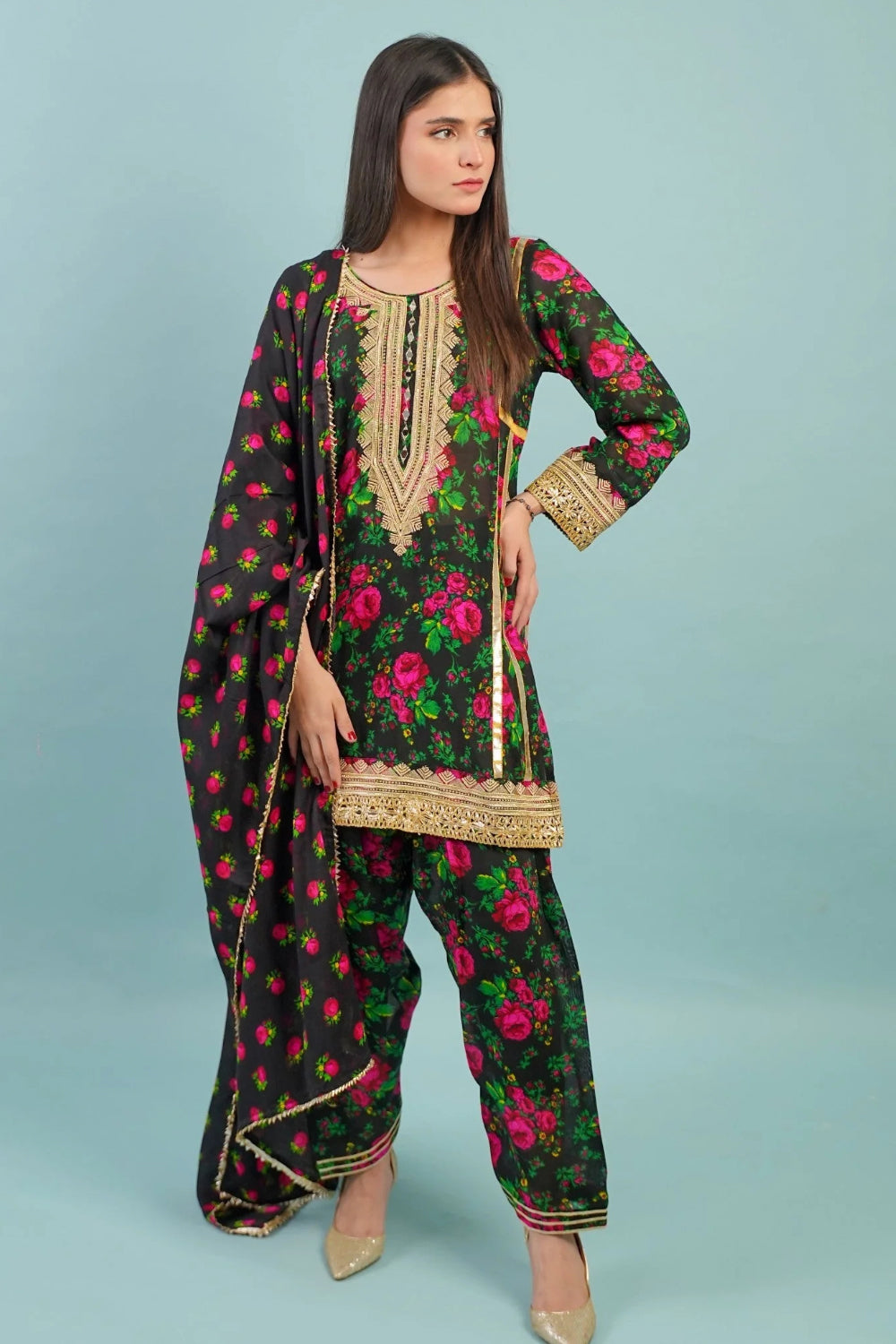 This exquisite Festive/Party Wear Kurta Set from Gulenoor is a fashion masterpiece. Made from acrylic fabrics, the straight black kurta features stunning Gota work detailing, giving it a festive allure. Complete with a shalwar bottom, this two-piece set is perfect for all seasons. Elevate your style with this outstanding outfit and enjoy its comfort and look.