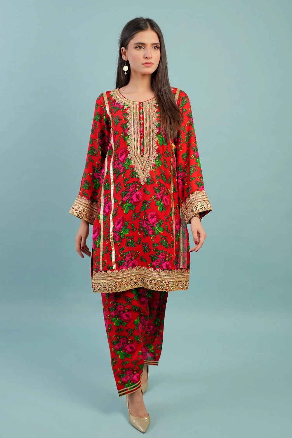 This exquisite Festive/Party Wear Kurta Set from Gulenoor is a fashion masterpiece. Made from luxurious acrylic fabrics, the straight red kurta features stunning Gota work detailing, giving it a festive allure. Complete with a shalwar bottom, this two-piece set is perfect for all seasons. Elevate your style with this outstanding outfit and enjoy its comfort and look.