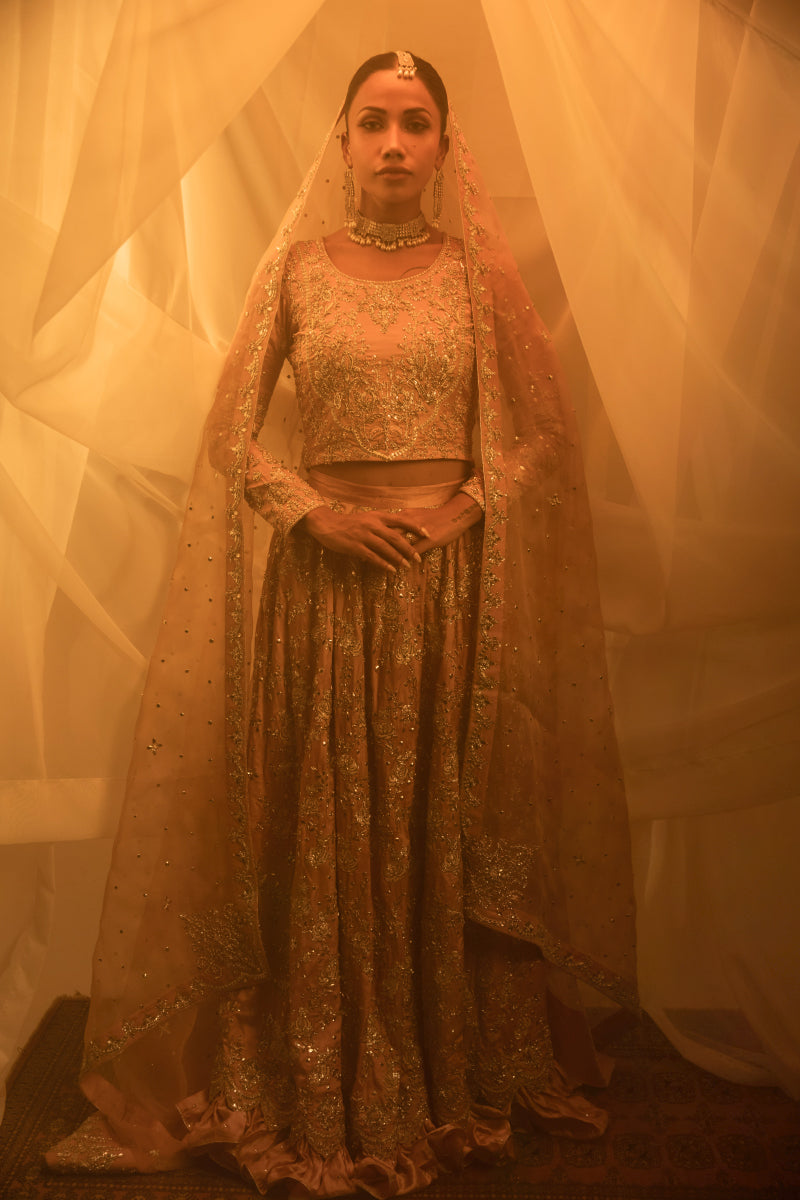 Dur-e-Fishan is a sophisticated bridal ensemble that balances tradition with understated elegance. Rendered in a soft peach palette, the choli and sharara are tailored in pure silk and adorned with meticulously hand-embroidered kamdani motifs.