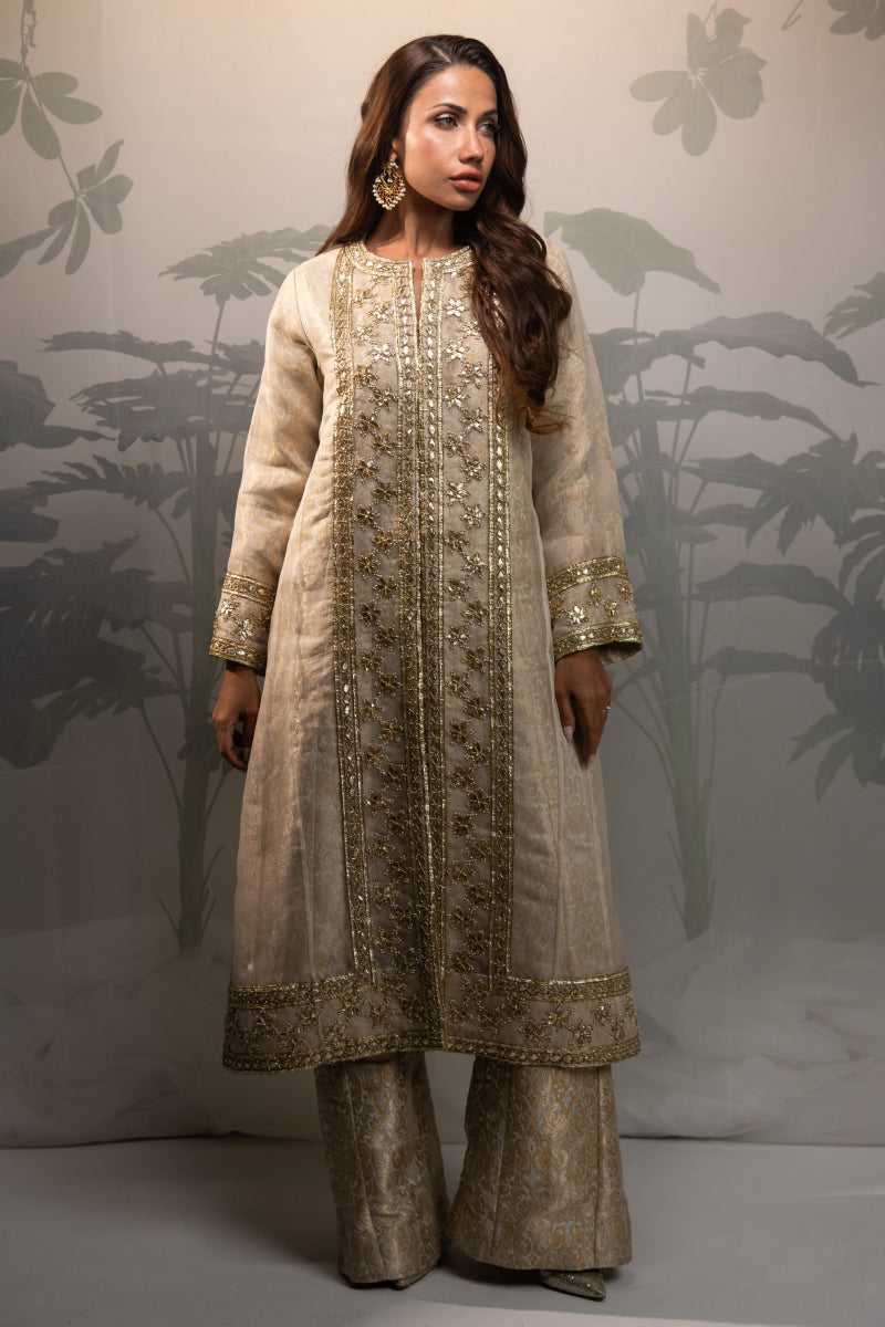 Gotta Patti is a formal wedding ensemble in off-white and gold, designed to balance subtlety with grandeur. The long two-paneled shirt is paired with boot-cut trousers, crafted in organza and atlas for a polished, fluid silhouette.