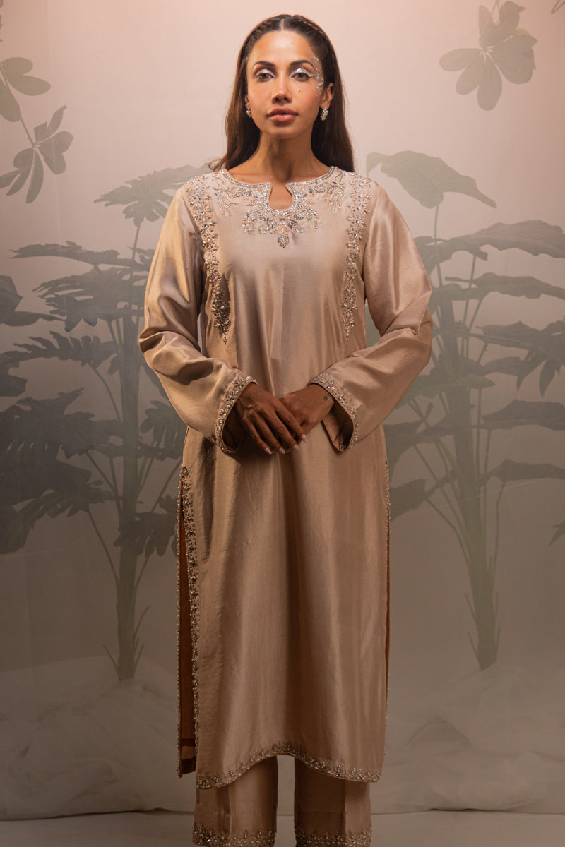 Rose Gold is a refined formal wedding ensemble defined by its soft colour palette and delicate work. Rendered in a pinkish beige hue, the design features a long raw silk shirt paired with tailored trousers and complemented by a lightweight soft organza dupatta.