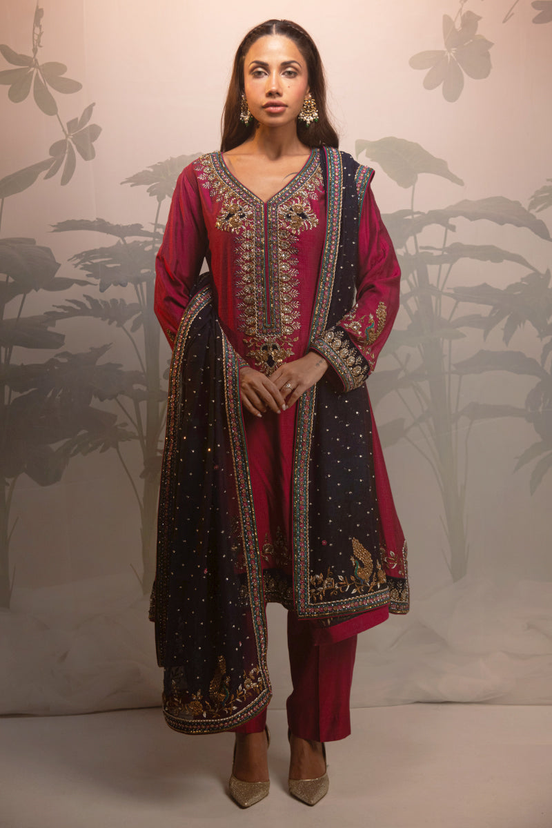 Taoos is a distinctive formal wedding ensemble defined by rich colour and contrast The design features a magenta raw silk suit paired with tailored trousers and finished with a lightweight peacock blue chiffon dupatta that adds movement and visual depth.