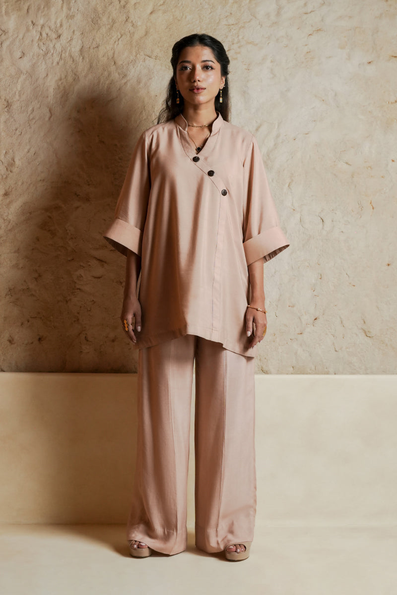 A soft blush toned cordset with an asymmetrical button-down and wide cuffed sleeves, paired with flowing trousers for a graceful silhouette. Airy, graceful, and refined.